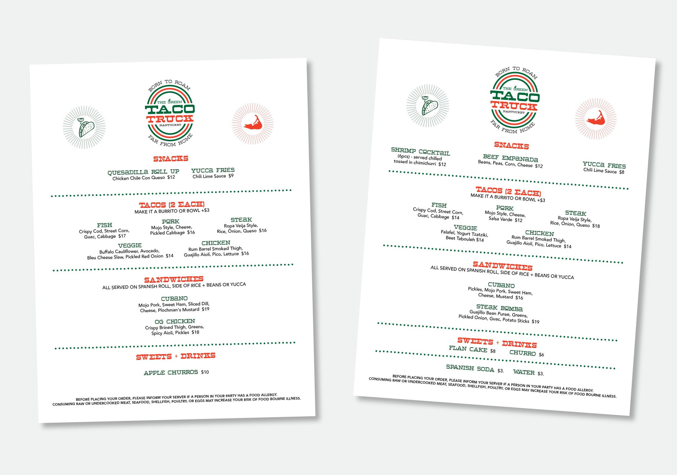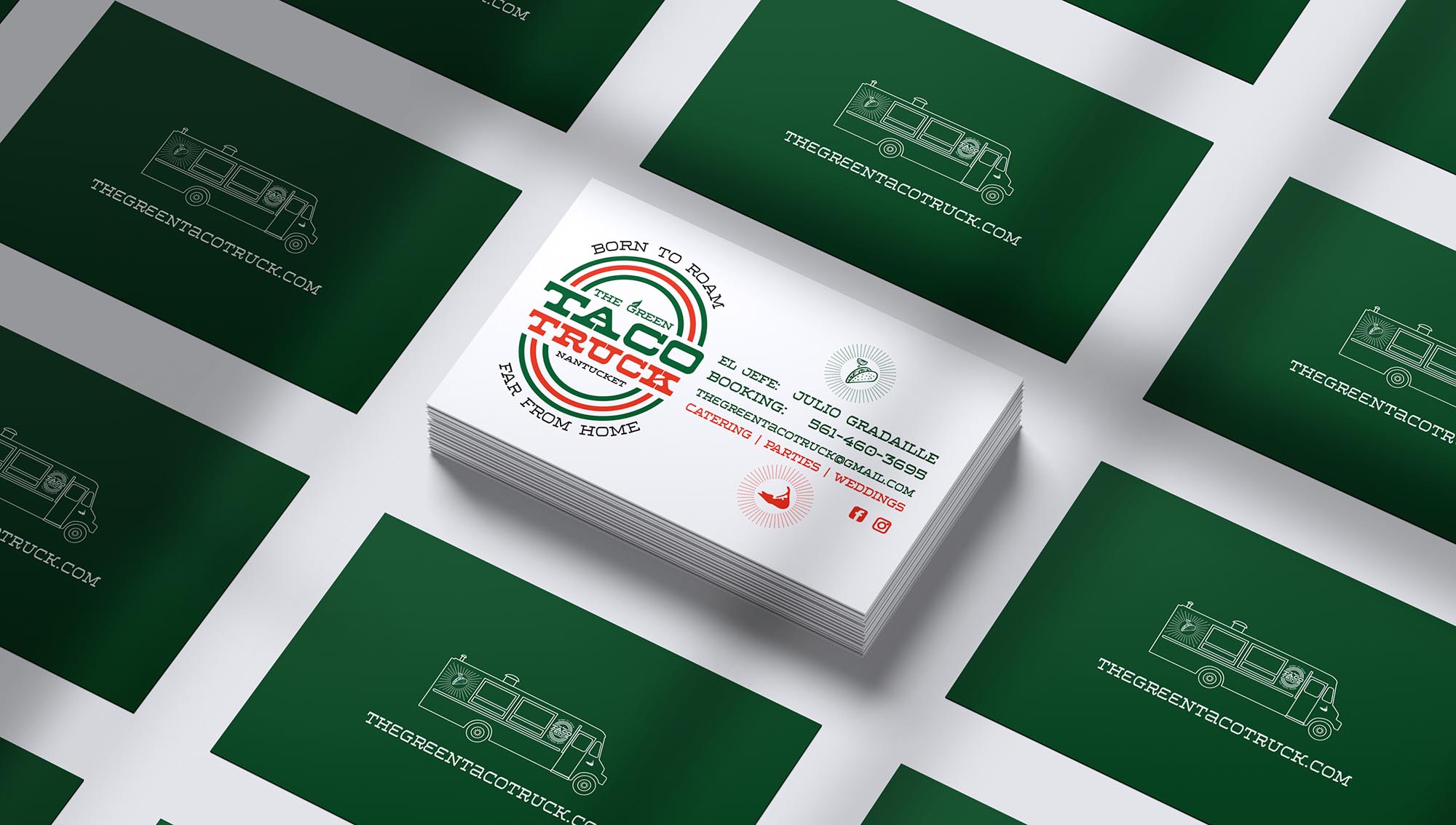 In 2021, we had the pleasure of working with Jenny Bence, owner of The Green on Nantucket, to develop branding for her exciting new venture, The Green Taco Truck. Jenny needed a comprehensive brand identity and a wrap design for a large food truck that would serve her signature taco offerings. I crafted a cohesive branding system, including a logo, the truck wrap design, a tagline, business cards, T-shirts, and the menu layout. Although the venture only operated for a few seasons, it was a dynamic, creative collaboration that truly showcased the power of design